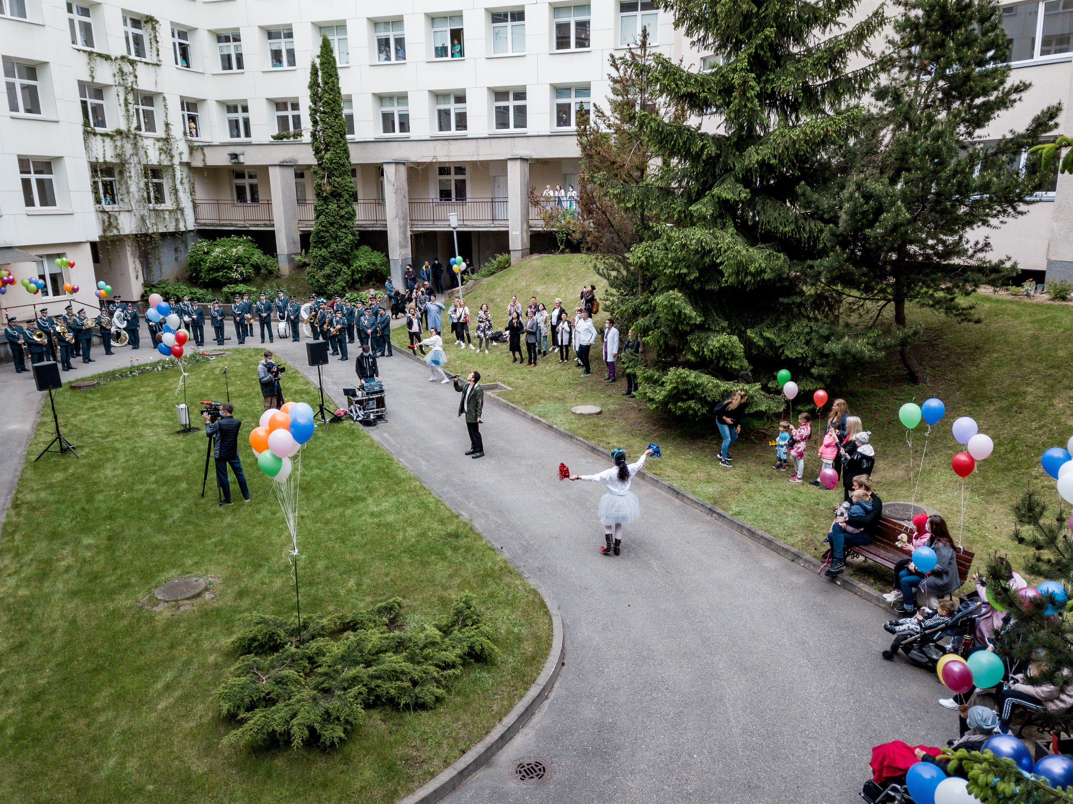 Mažuosius pacientus kartu su gydytojais-klounais džiugino LR VRM Reprezentacinio pučiamųjų orkestro muzikiniai garsai ir iškilmingas paradas. Šventiškai nusiteikę orkestro muzikantai pradėję žygiuoti aplink Vaikų ligoninės chirurginį korpusą, pasirodymą tęsė pediatrijos korpuso kiemelyje. Vidiniame kiemelyje susirinkusių pacientų laukė net tik įspūdingas pučiamųjų orkestro parengtas pasirodymas, bet ir dresuotų šuniukų šou bei žaismingas žonglieriaus numeris.