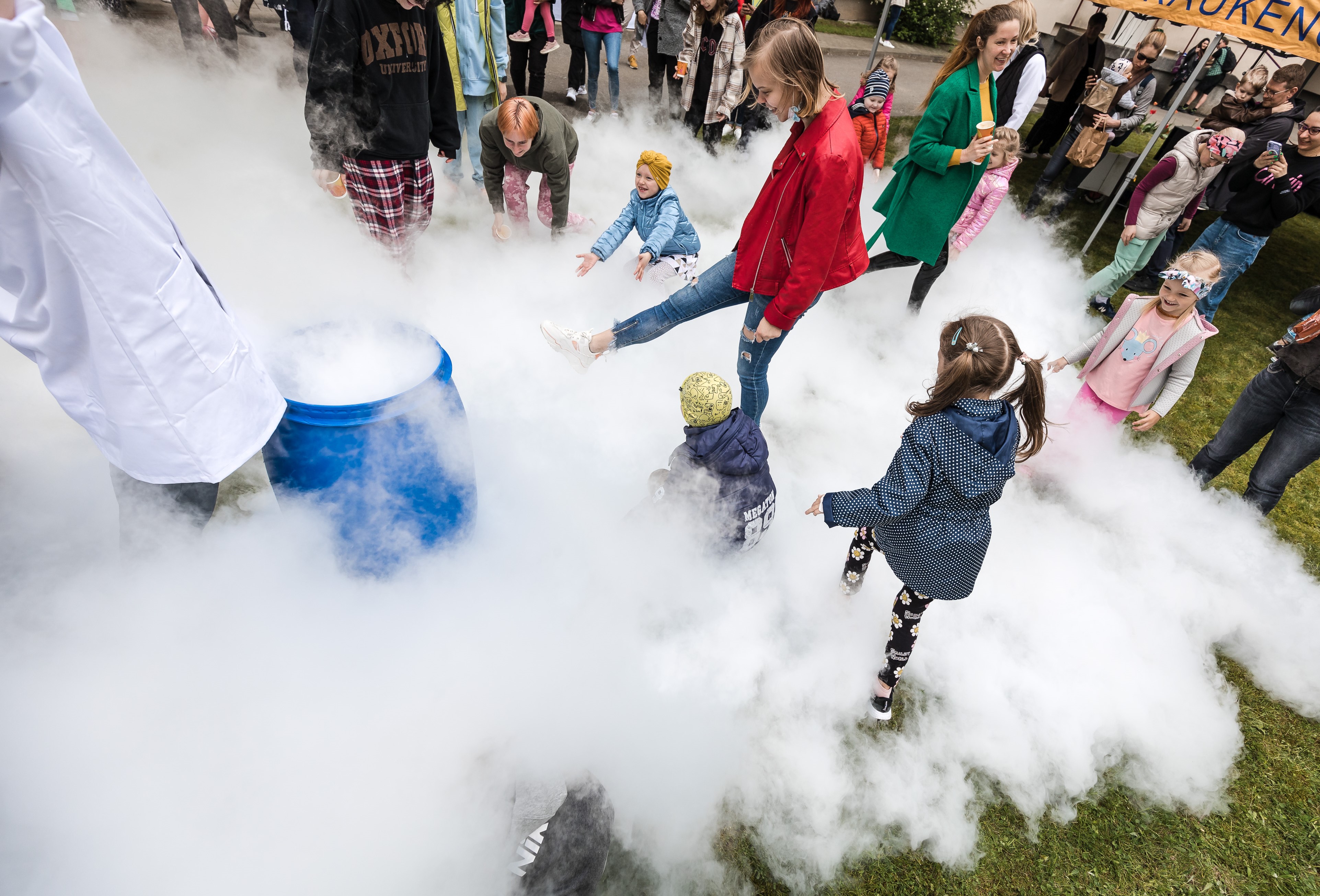 Nuo pačio ryto VRM Reprezentacinio pučiamųjų orkestro muzikiniai garsai ir iškilmingas paradas su gydytojais klounais priešaky džiugino mažuosius pacientus. Vaikai ir jų tėvai buvo kviečiami rinktis į vidinį ligoninės kiemelį, kur laukė jaudinanti programa. N2 mokslininkai demonstravo vaikams kaip veikia fizikos dėsniai rodydami kvapą gniaužiančius eksperimentus su stingdančiu azotu, kokią liepsną galima sukurti iš įvairiausių dujų, o pasirodymą vainikavo išsiveržiantis spalvingų kamuoliukų griaustinis. Negalintys palikti palatų vaikai viską stebėjo per ligoninės langus.